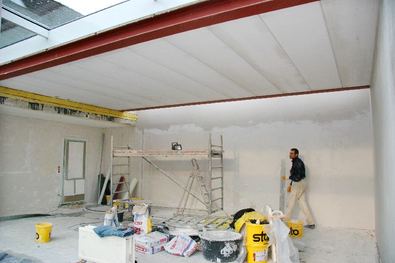 Dem Putzer gelingt mit einem 1,5m breiten Spachtel der tadellose Übergang von der bestehenden Wand an die Aufmauerung