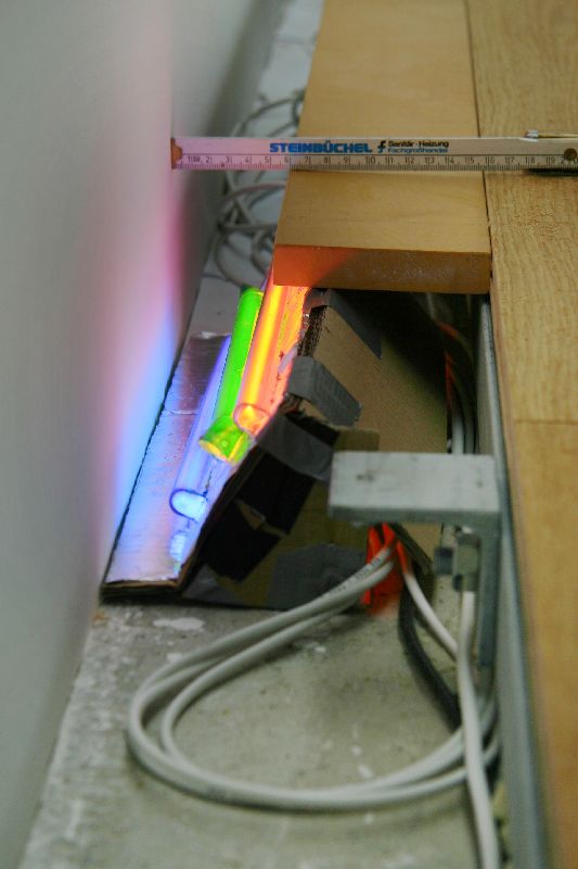 Probemuster mit Neonröhren auf Pappkarton in der Lichtfuge