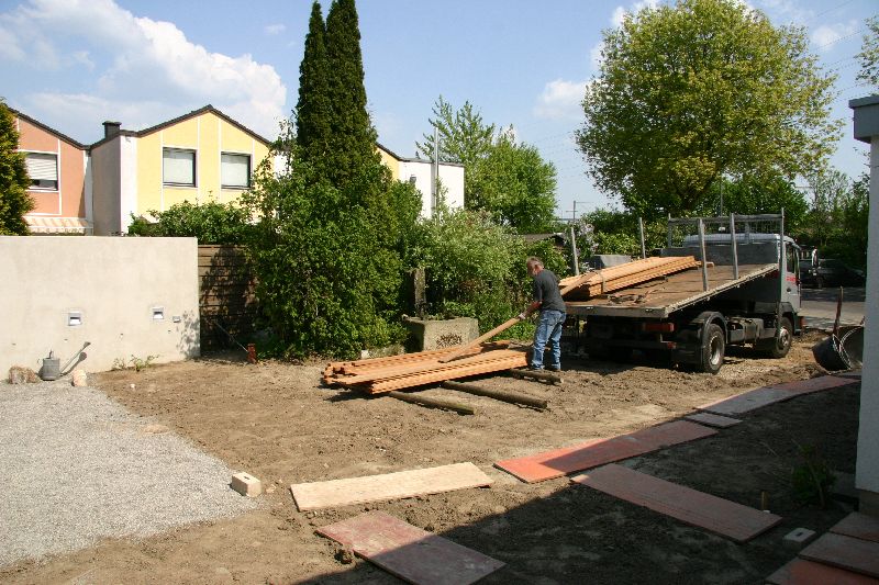 Bangkirai-Holz für den Terrassenboden. Und hoffentlich der letzte Lastwagen im Garten.