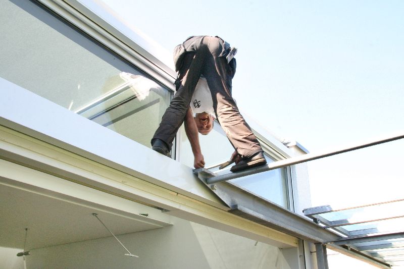 In aktrobatischer Stellung verbindet der Dachdecker das Terrassendach mit der Fensteranlage