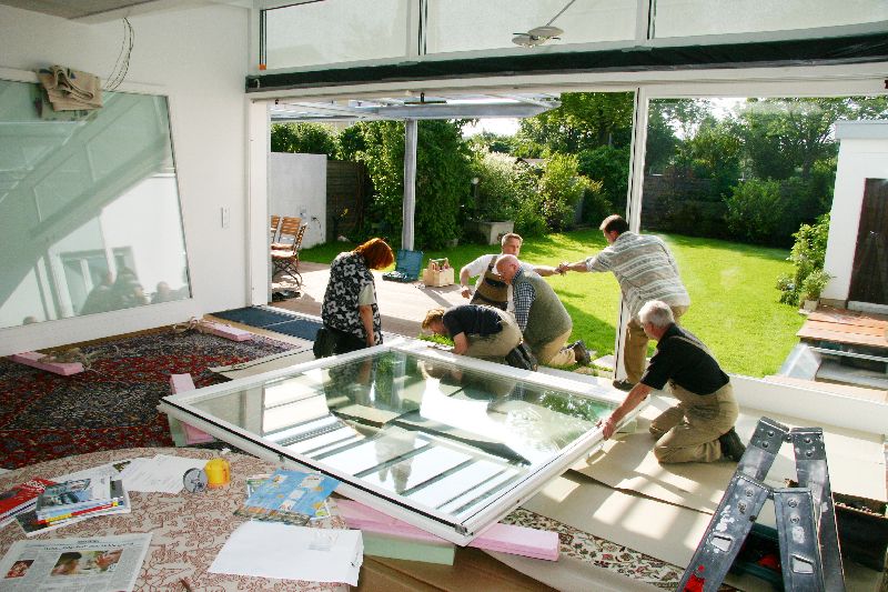 Weil sich das Hubgestänge aushakte wurde die Schiebetüre mit sechs (!) Personen demontiert.