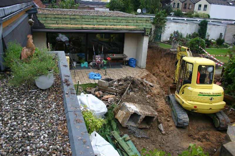 Der kleiner Bruder des Abrissbaggers übernimmt die Ausschachtung für den Lichthof im Untergeschoss.