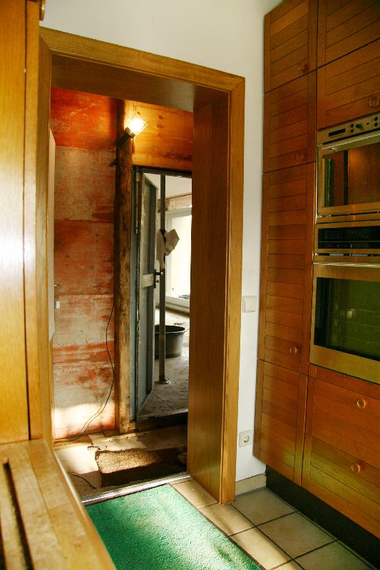 Die Türe von der Küche zum Wohnzimmer führt nun auf eine provisorische Trenwannd, die den bewohnten Hausteil vor den Unbillen des bevorstehenden Herbstes und Winter schützen soll.